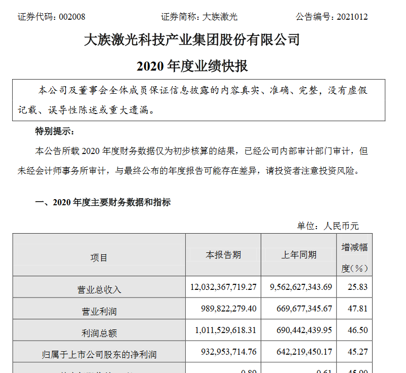 2020年1-12月營業(yè)總收入為 12,032,367,719.27元,比上年同期增長25.83%;歸屬于上市公司股東的凈利潤為 932,953,714.76元,比上年同期增長45.27%。