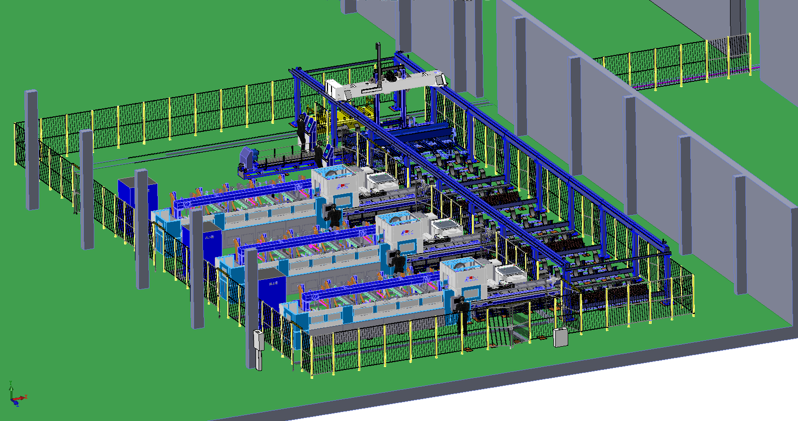 激光切管柔性生產(chǎn)線(切管FMS)將庫房至激光加工車間之間建立一條自動傳輸線,實(shí)現(xiàn)成捆原材料及成品往返傳輸。